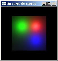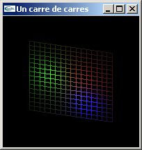 La fonction développée prend l'entier n et le réel c en paramètres. La normale affectée aux sommets créés est toujours la même: (0.0, 0.0, 1.0). Les sommets sont créés au moyen de la fonction glVertex2f. La coordonnée z des sommets est alors implicitement fixée à 0.0. Les n*n facettes modélisant le carré peuvent être créées au moyen de deux techniques alternatives: