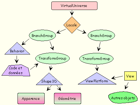 Deux composants superstructures: un objet VirtualUniverse et un objet Locale. Un ensemble de graphes branches dont les racines individuelles sont des objets BranchGroup. VirtualUniverse: Racine d'un graphe de scène. Une application peut contenir plusieurs "Univers Virtuels". Locale: Définit l'origine (repère) de tous les graphes branches. BranchGroup: Nud racine d'un graphe branche. Les graphes branche prennent en charge les diverses fonctionnalités liées à l'affichage 3D: construction de la scène, définition des paramètres de visualisation, ... Source correspondant au schéma ci-dessus |