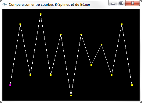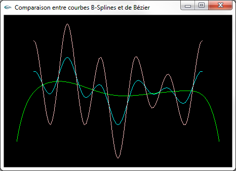 La matrice de base utilisée pour la génération des morceaux de Spline est et l'intervalle de variabilité uniforme de t est [0.0,1.0].