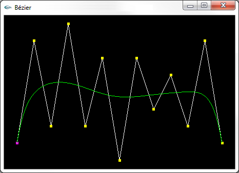 P0, P1, P2, P3, ..., Pn sont les n+1 points définissant une ligne polygonale (n > 1). La courbe de Bézier définie par ces points est défnie par l'équation paramétrique de degré n suivante :