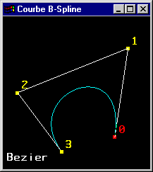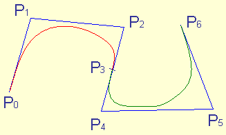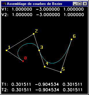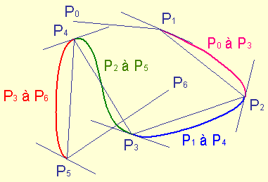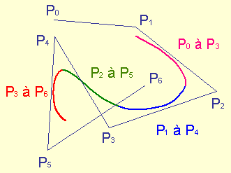 C(t) = (x(t), y(t), z(t)) = Problème: Acquérir un contrôle local et obtenir un bon lissage avec beaucoup de points de contrôle. Solution: Relier deux courbes de Bézier définies sur quatre sommets tels que le dernier sommet définissant la première courbe soit aussi le premier sommet de la seconde. C'est à dire tracer la courbe Pi avec 0 <= i <= 6 (soit au total 7 sommets différents).