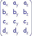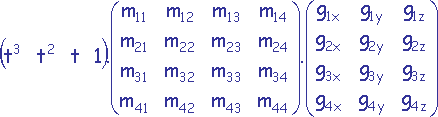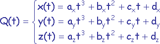 Quatre coefficients numériques constants sont nécessaires pour définir chacune des trois équations paramétriques. On transforme la matrice C donnée précédemment en la matrice produit M.G où M est une matrice 4x4 (appelée matrice de base) et G est un vecteur colonne de quatre contraintes géométriques (appelé vecteur géométrie). Q(t) = (x(t), y(t), z(t) ) = T.C = T.M.G =
