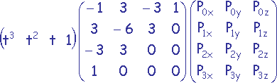 Pour obtenir des segments de courbe, on considère que t appartient à un intervalle [min,max] (fréquemment [0.0,1.0]). Reformulation mathématique Soit le vecteur T = (t3, t2, t, 1), (1) sécrit sous la forme