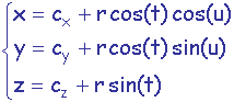 t et u appartiennent à R, Surface sphérique de centre (cx,cy,cz) de rayon r dans l’espace (3D):