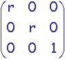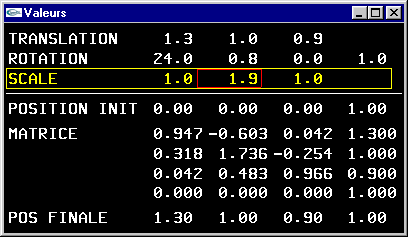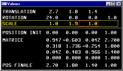 Les coordonnées sont généralement soit toutes réelles (R) soit toutes entières (Z). Un objet graphique pourra être modélisé par un ensemble de facettes elles-mêmes modélisées par un ensemble de sommets. Les directions sont aussi réprésentées par des vecteurs à 2 dimensions dans un espace 2D et des vecteurs à 3 dimensions dans un espace 3D. Cas particulier: Un objet paramétrique est défini implicitement par les équations le représentant. Une transformation géométrique de type rotation ou zoom appliquée aux positions prend la forme d'une matrice carrée M de dimension la dimension de l'espace de travail. Cette matrice appliquée à une position P donnera la position P' transformée par calcul du produit matriciel P' = M * P. Important: Les directions sont aussi transformées par cette technique -> Outil unique pour ces 2 catégories d'objet. Exemples de matrices de transformation: En trois dimensions