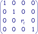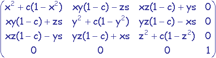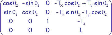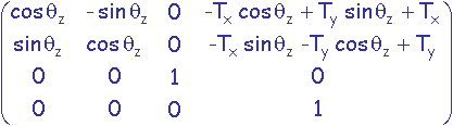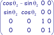 Composition de transformations On désire réaliser une transformation A sur une position (resp. une direction) X puis ensuite la transformation B pour obtenir la position (resp. la direction) Y, on pourra réaliser: Y = A.X puis Y = B.Y qui est équivalent à Y = B.(A.X) ou bien encore Y = (B.A).X. Toutes les matrices de transformation (canoniques comme définies ci-avant ou totalement arbitraires) sont composables pour obtenir une transformation représentative de la réalisation successive de ces transformations géométriques. Les matrices de transformation apparaissent dans le produit dans l'ordre inverse de l'ordre selon lequel elles interviennent effectivement. Propriétés Associativité des produits matrice par matrice et matrice par vecteur. Attention!!! Non commutativité des produits matriciels. On désire établir la transformation consistant à effectuer une rotation de qz radians autour de l'axe colinéaire à z passant par le point P de coordonnées (Tx,Ty,Tz). Cette transformation M est réalisée en amenant P à l'origine par une translation T de -P, puis en effectuant une rotation R d'angle qz autour de l'axe Oz, et enfin en ramenant P à sa position initiale par une translation T' de P. M = T'.R.T