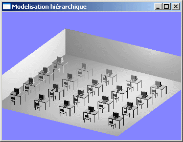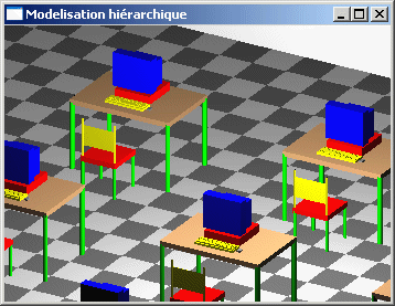 Il est recommandé d'effectuer le travail de modélisation par assemblage hiérarchisé. Exemple : Une salle de TP sera modélisée par des tables, des chaises et des ordinateurs. Une chaise sera modélisée par quatre pieds, une assise et un dossier. Une table sera modélisée par un plateau et quatre pieds. Un ordinateur sera modélisé par un clavier, une souris, une UC et un écran... Cette technique permet de réutiliser les objets si la primitive conçue pour chacun d'eux est correctement renseignée :