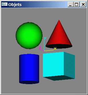 Les objets géométriques canoniques, quels qu'ils soient, sont de caractéristiques précisément connues. Exemple: Le cube est centré sur l'origine, a ses faces orthogonales aux axes et a pour côté la longueur 1. Précision : Suivant l'algorithme de rendu utilisé au moment de la phase de dessin, les objets géométriques qui ne sont pas des ensembles de facettes auront peut-être à être transformés en ensembles de facettes les approximant plus ou moins bien. Le développeur aura alors à sa disposition des primitives d'affichage graphique qui pourront être paramétrées pour permettre d'obtenir une plus ou moins grande précision de transformation, c'est à dire obtenir plus ou moins de facettes. Objets C.S.G. (Constructive Solid Geometry) Deux opérations de composition en plus de l'union :
