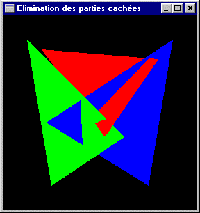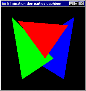 while(1) { -> L'élimination des parties cachées n'est pas forcément correctement réalisée car un algorithme du peintre est utilisé pour créer chacune des images. Les objets sont affichés les uns sur les autres dans l'ordre d'exécution du programme et donc l'ordre d'affichage a une influence sur le résultat obtenu. Si l'ordre est bon, l'élimination des parties cachées est réalisée.