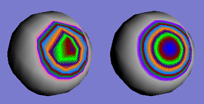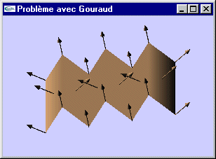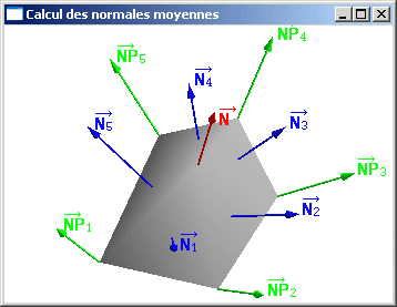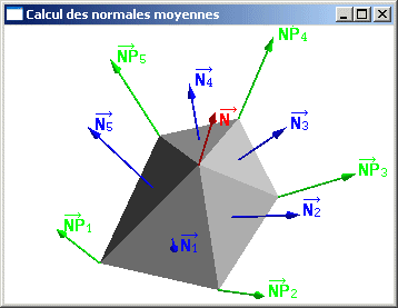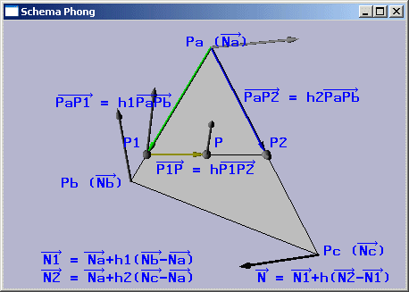 Principe: Réaliser le calcul d'illumination par interpolation directe à partir des normales associées aux sommets des facettes. Pour chaque pixel, on aura une normale interpolée qui permettra le calcul de l'illumination en ce pixel par une formule donnant la quantité de lumière diffusée (Lambert).