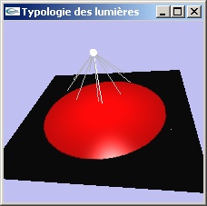 Les librairies 3D sont généralement axées sur la seule modélisation des réflexions diffuses et spéculaires vis à vis de sources lumineuses identifiées comme telles (en particulier à l'exclusion des objets eux-mêmes considérés en tant que sources lumineuses) et proposent généralement des approximations visant à représenter les autres phénomènes (éclairage ambiant, transparences, ...). Ces approximations permettent de faciliter la construction de l'éclairage des scènes.scènes. Pour chaque objet, définition d'un "matériel" de surface autorisant l'interaction avec différents types de lumières :