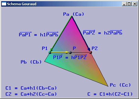 Chaque facette est munie de trois couleurs: une pour chacun de ses sommets. On attribue une couleur à chacun des pixels interne à la facette par double interpolation linéaire (interpolation bilinéaire) entre ces trois couleurs.
