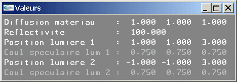 simpleBitmapOutput(1,REGULAR8x13,"Coul speculaire lum 1 : %6.3f %6.3f %6.3f",spec1[0],spec1[1],spec1[2]) ;