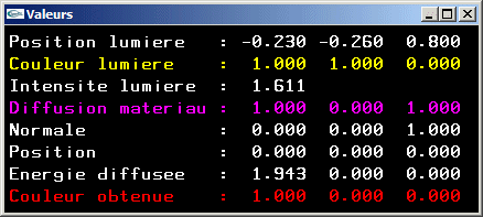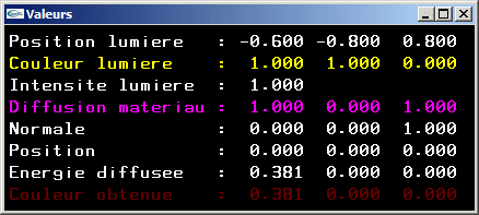 simpleBitmapOutput(1,REGULAR8x13,"Couleur lumiere : %6.3f %6.3f %6.3f",lp.c.r,lp.c.v,lp.c.b) ;
