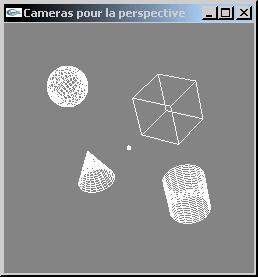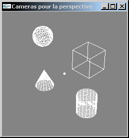 TD 5: Les caméras en VRML et en OpenGL Soit la scène constituée d'une sphère, d'un cube, d'un cylindre et d'un cône placés respectivement centrés sur les positions (-3, 3, 0), (3, 3, 0), (3, -3, 0) et (-3, -3, 0). (a) Écrire un fichier VRML visualisant en gros plan la scène selon un point de vue placé en position (0, 0, 20) visant l'origine: axe de visée (0,0,-1).