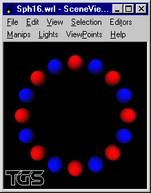 Soit la scène constituée de 16 sphères de rayon 3 placées régulièrement sur un cercle de rayon 20 centré sur l'origine et situé dans le plan xOy. Ces sphères sont ernativement rouges et bleues. Sur les sphères rouges, un liens hypertexte existe permettant d'atteindre http://iup3gmi.univ-fcomte.fr.