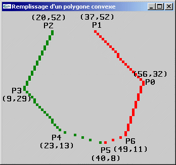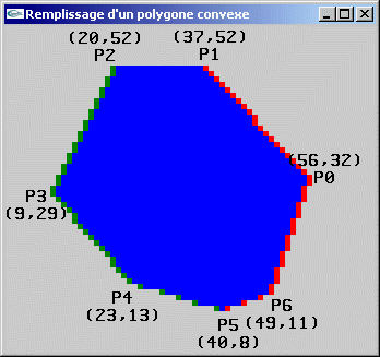 c) Programmer une fonction de calcul de l'abscisse du pixel le plus à gauche de chaque trame où apparait le contour gauche d'un polygone convexe. d) Ecrire une fonction de remplissage d'un polygone convexe avec une couleur arbitraire.