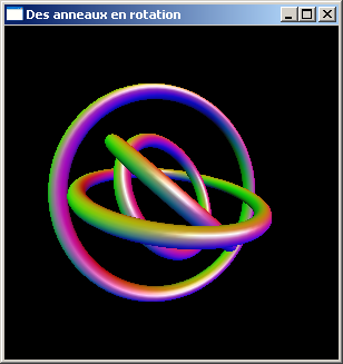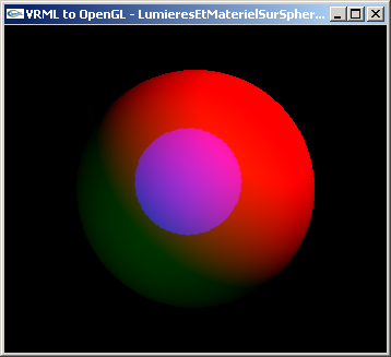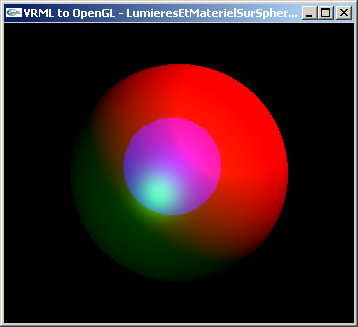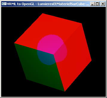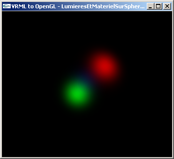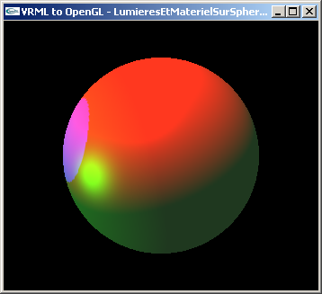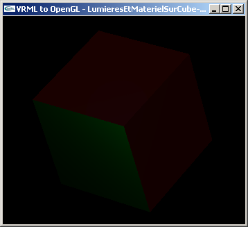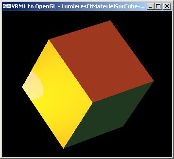 Exercice n°4 : Ajout de composantes ambiente et en émission Modifier une dernière fois les fichiers précédents pour définir la composante ambiente du matériel avec la valeur (0.1, 0.1, 0.1) et la composante émissive avec la valeur (0.1, 0.2, 0.1). Tourner la scène pour visualiser l'influence de ces composantes sur les zones non éclairées par les trois lumières.