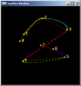 Exercice n°2 On considère les 8 sommets de l'exercice n°1. Ecrire un programme calculant et affichant les courbes B-Splines NRU et Catmull-Romm correspondant aux 5 quadruplets de sommets consécutifs extraits de cette suite de sommets.