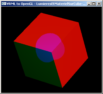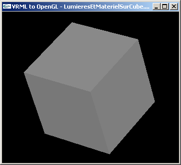 TD n°6: Matériaux et lumières en VRML Si le viewer VRML utilisé ne fournit pas des résultats jugés comme étant de qualité suffisante, WRL2OGL peut être utilisé à la place. Les deux fichiers suivants contiennent des scènes minimum constituées pour la premiére d'une caméra et d'un cube après une rotation, et pour la seconde, d'une caméra et d'une sphère. Exercice n°1 : Diffusion Modifier chacun des deux fichiers pour y ajouter 3 lumières et un matériel selon les caractéristiques suivantes: