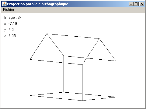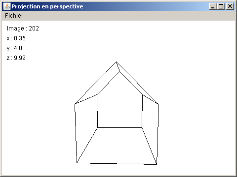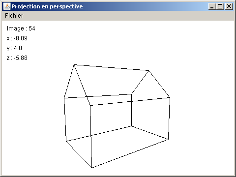 Exercice n°2 Dans l'exercice précédent, la méthode public void paint(Graphics g,int numeroImage,int tx,int ty) de la classe AfficheurProjectionOrthographique réalise les opérations nécessaires au dessin d'une image de l'animation (hors effacement du canvas réalisé automatiquement par ailleurs). Elle pourrait être vue comme l'équivalent des fonctions reshape et display d'un programme OpenGL+GLUt écrites en une seule fonction. Vous disposez seulement de la classe principale suivante: La classe AfficheurProjectionPerspective ne vous est pas fournie. Le but de l'exercice