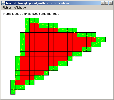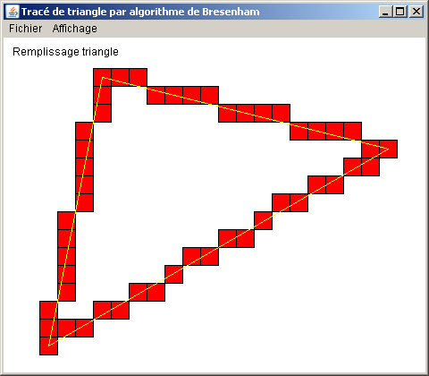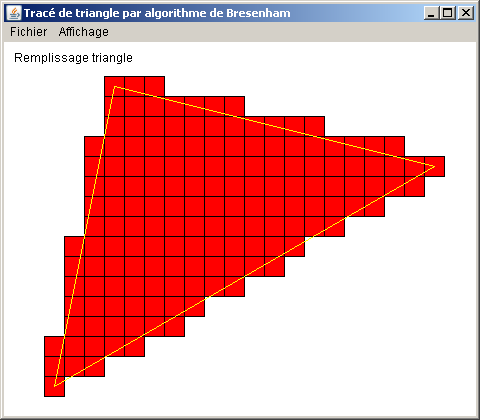 TP n°8: Algorithmique de l'Infographie : Remplissage d'une facette triangulaire On souhaite réaliser le remplissage d'une facette triangulaire 2D dont les trois sommets sont situés aux positions (5, 17), (2, 2) et (21, 13). Sur la base du framework proposé en solution du TP n°7, développer un Afficheur réalisant le dessin de cette facette.
