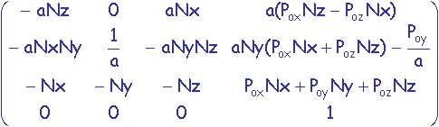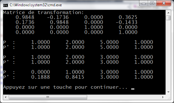 La matrice de transformation utilisée est: Dériver de la classe TransformationGeometrique3D une classe LookAt implantant la transformation géométrique ci-dessus. Utiliser cette classe pour réaliser la transformée des positions définies dans le tableau smmts. On choisira Po = (200.0,60.0,120.0) et Pv = (0.0,0.0,0.0).