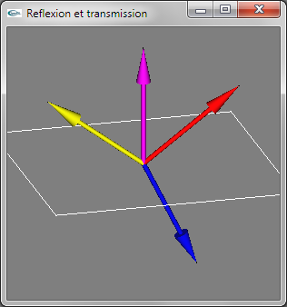 Fig 1: Rayon incident en jaune, normale en magenta, rayon réfléchi en rouge, rayon transmis en bleu