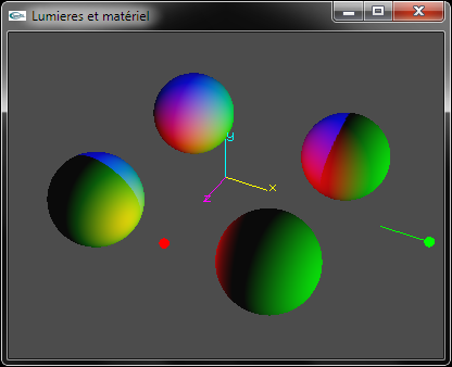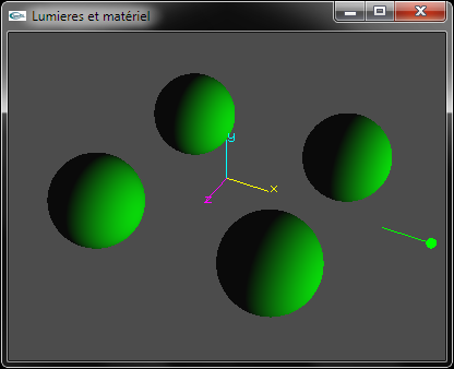 b) Développer le code source OpenGL permettant de configuer la lumière n°1 en tant que lumière directionnelle de direction d'incidence (1.0, 0.0, 0.0). Sa composante d'émission diffuse est verte. Sa composante d'émission spéculaire est blanche.