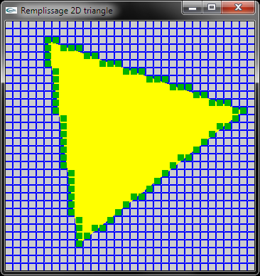 Méthode: Remplir un triangle en 2D peut être réalisé en traçant toutes les lignes horizontales de pixels délimitées par ses bords gauche et droit. Il convient donc de déterminer les abscisses extrèmes de ces lignes horizontales pour chacun des y compris entre ymin et ymax où ymin (resp. ymax) est la valeur minimale (resp. maximale) des ordonnées des 3 sommets de définition du rectangle.