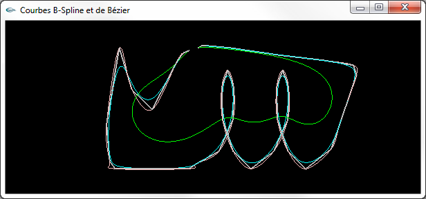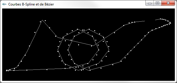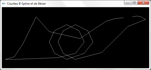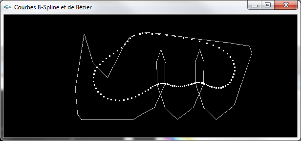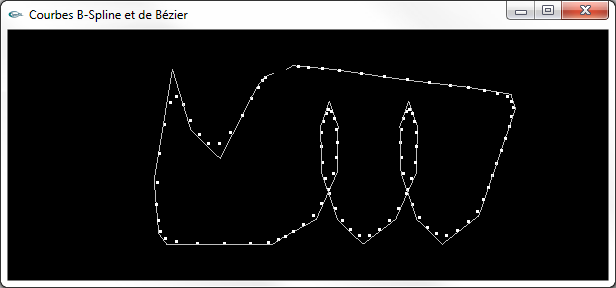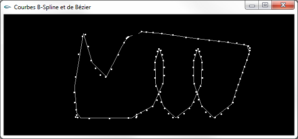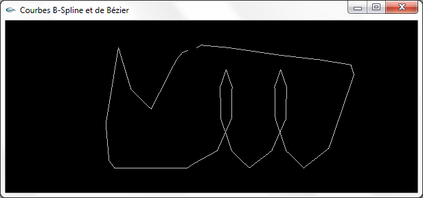 Si vous le souhaitez, vous pouvez vous aider du code source suivant BSplineEtBezierBase.cpp qui implante toute la partie OpenGL du code nécessaire, la déclaration des 37 points ci-dessus, mais où la fonction scene() se limite à afficher le segment de droite qui va du point d'indice 0 au point d'indice 36 c'est à dire le segment qui correspond au trou dans les images ci-dessus. Notre but est maintenant de superposer cette ligne polygonale et une courbe lissée obtenue en l'utilisant comme liste de points de contrôle.