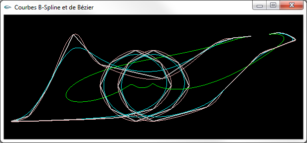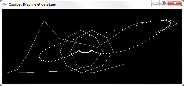 On notera le peu d'attractivité de la ligne polygonale sur la courbe de Bézier. On notera aussi que les points de la courbe de Bézier ne sont pas uniformément répartis sur la courbe même si on fait varier t uniformément. En effet, ils sont plus resserrés là où les points de contrôle sont plus resserrés.
