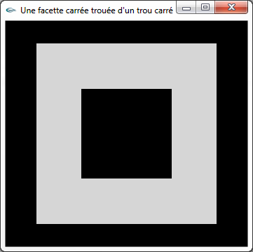TD n°2 : Modélisation par facettes Exercice n°1 Modéliser par facettes une facette carrée percée d'un trou carré. Cette facette est plongée dans le plan xOy, centrée sur l'origine du repère de modélisation, de cotés parallèles aux axes x et y et de cotés de longueur 2.0. Le trou est centré sur l'origine du repère de modélisation, de cotés parallèles aux axes x et y et de cotés de longueur 1.0.