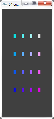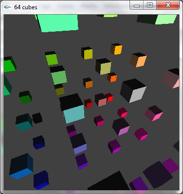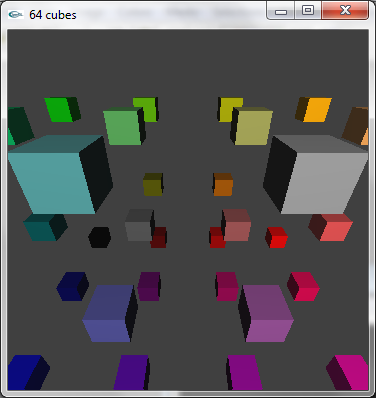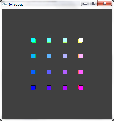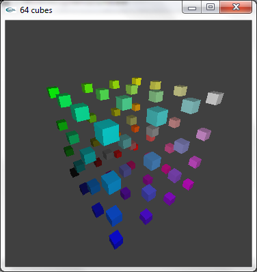 de 4x4 cubes de façon à occuper un volume cubique de coté 6.5 centré sur l'origine du repère de modélisation. Les cubes sont colorés en fonction