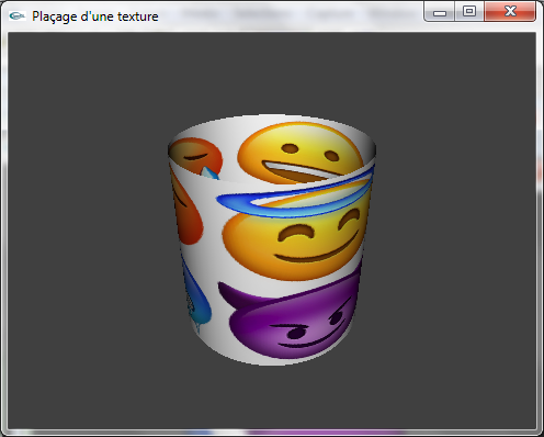 d) Reprendre la fonction de modélisation de cylindre de l'exercice n°2 du TD n°3 pour y ajouter les instructions permettant de le recouvrir d'une texture. Dans le programme de la question (c), remplacer le rectangle par un cylindre de hauteur 5.0 et de rayon 2.5.