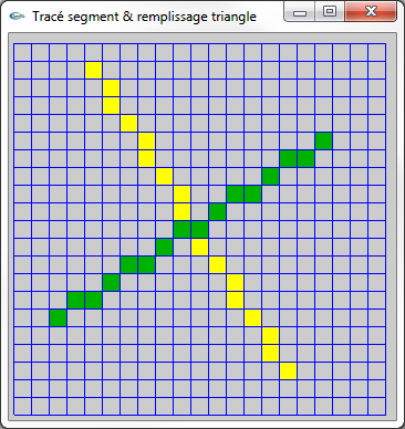 b) Modifier le programme de la question (a) pour y intégrer une fonction de dessin d'un segment de droite par algorithme de Bresenham et la tester