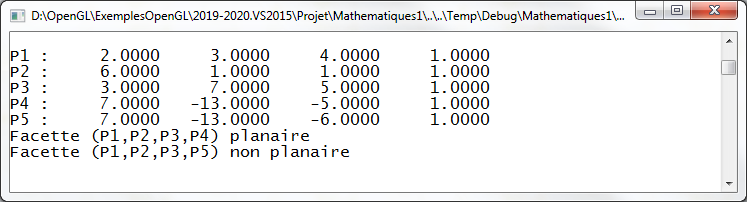 TD n°5 : Coordonnées homogènes et test de planarité Exercice n°1 Proposer une méthode permettant de tester la planarité d'une facette non dégénérée à 4 sommets. Exercice n°2 a) Développer en C++ une classe coordonnees homogenes 3D nommée CH3D. b) Dériver de la classe CH3D une classe position 3D nommée Pos3D utilisable pour le stockage de positions dans un espace à trois dimensions. c) Dériver de la classe CH3D une classe direction 3D nommée Dir3D utilisable pour le stockage de directions dans un espace à trois dimensions. d) Développer une méthode de calcul du produit scalaire de deux Dir3D. e) Développer une méthode de calcul du produit vectoriel de deux Dir3D. f) Implanter une fonction ou une méthode de test de la planarité de facettes à 4 sommets.
