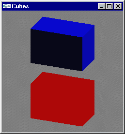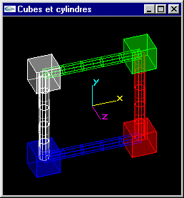 Réaliser l'implantation OpenGL de cette scène. TD 4: Les primitives graphiques en OpenGL Exercice 1 a) Ecrire une fonction de modélisation d'une boite parallélipipédique de dimension (tx,ty,tz). Cette fonction devra seulement assurer la création des facettes (boite rouge sur l'image proposée). b) Modifier la fonction précédente pour y inclure la gestion des normales aux facettes (utilisées pour les calculs d'éclairages) (boite bleue sur l'image proposée).