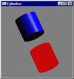 Exercice 2 a) Ecrire une fonction de modélisation d'un cylindre de rayon r, de hauteur h, possédant sh sections en hauteur et sa secteurs sur sa base. Cette fonction devra seulement assurer la création des facettes (cylindre rouge sur l'image proposée). b) Modifier la fonction précédente pour y inclure la gestion des normales aux facettes (utilisées pour les calculs d'éclairages) (cylindre bleu sur l'image proposée).