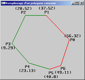 c) Programmer une fonction de calcul de l'abscisse du pixel le plus à gauche de chaque trame où apparait le contour gauche d'un polygone convexe. d) Ecrire une fonction de remplissage d'un polygone convexe avec une couleur arbitraire.