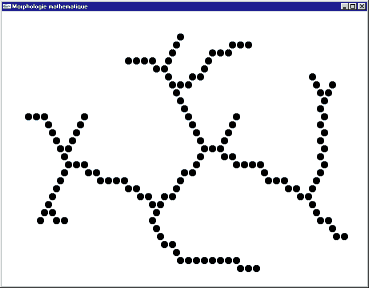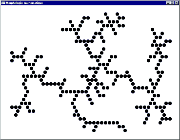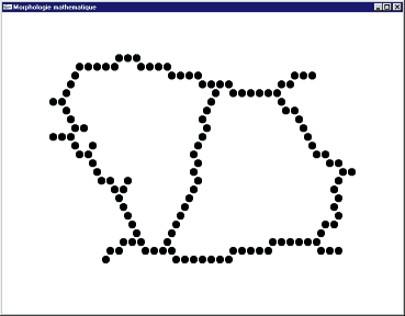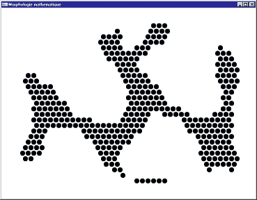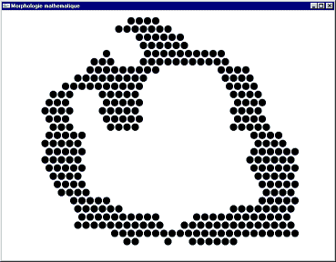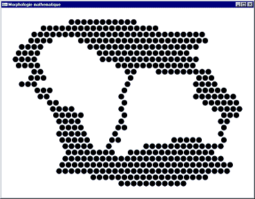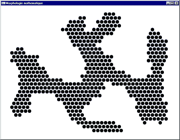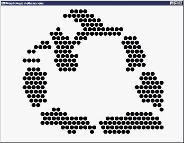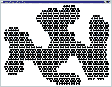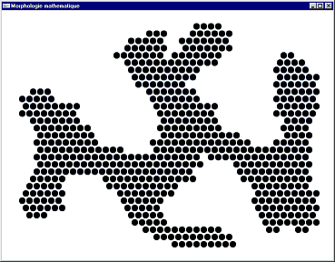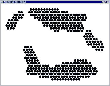 Les algorithmes de morphologie mathématique permettent de travailler sur les images 1 bit (noir et blanc) pour mettre en évidence leurs propriétés particulières. Dans les exemples donnés ici, on travaille sur des images plaquées sur pavage hexagonal. Ces algorithmes sont basés sur l'utilisation d'"éléments structurants" (notés B), c'est à dire des configurations élémentaires de pixels à rechercher dans l'image.