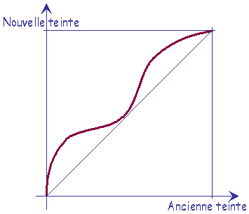 Eclaircissement (Tassement du spectre vers la droite) Si on diminue le contraste, la teinte des pixels est déplacée pou rapprocher vers la teinte moyenne, et généralement dans les mêmes proportions, les composantes de vert, de rouge et de bleu. Si on augmente le contraste, la teinte des pixels est déplacée pour rapprocher du maximum (resp. minimum), , généralement dans les mêmes proportions, les composantes de valeur supérieure (resp. inférieure) à la moyenne.