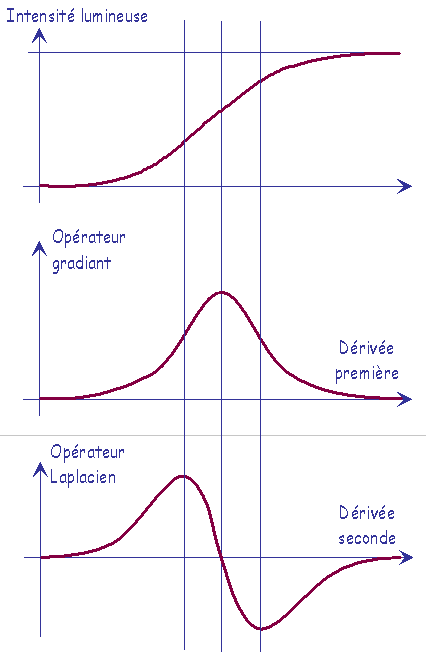Les contours sont les lignes de maximum locaux pour les filtres de gradient. Pour les filtres Laplaciens, les contours seront les suites de points à 0.