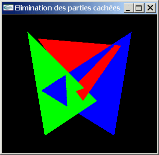cachées généralement utilisé par OpenGL car c'est celui qui est généralement implanté sur les adaptateurs graphiques. Cet algorithme permet de s'assurer qu'un objet situé tout ou partiellement derrière un autre objet du point de vue de l'observateur apparaîtra rééllement totalement ou partiellement masqué par l'objet en premier plan. OpenGL permet à tout instant l'activation ou la désactivation de l'élimination des parties cachées. Si les parties cachées ne sont pas éliminées, les objets graphiques sont affichés les uns sur les autres dans l'ordre d'exécution de leurs ordres d'affichage. L'élimination des parties cachées réalisé par OpenGL s'accomode parfaitement de scènes où les objets se recoupent les uns les autres ainsi que d'un ordre arbitraire d'affichage de ces objets. |