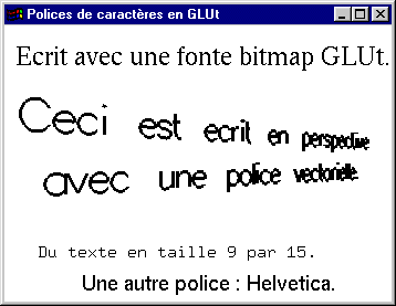 GLUT gère les polices de caractères bitmap et vectorielle. L'avantage des polices bitmap est une grande rapidité d'affichage, tandis que les polices vectorielles supportent les fonctions GL classiques telles que glTranslatef, glScalef, glRotatef, glLineWidth, ...